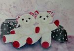 2011De dochter van mijn opdrachtgever ging het huis uit. Ze kreeg haar oude knuffels mee. Het is Bollie en reserve Bollie. De koffertjes heb ik erbij geschilderd omdat ze op reis gingen. Nopjes en zwart wit waren haar favorieten. De zeepbellen maakten het speels. Het rood mocht krachtig zijn en de oortjes waren lekker versleten, dus grappig om te schilderen.