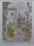 2018Straatje met stokrozen op het eiland Ile de Ré. Ets met aquarel. In passepartout buitenmaat 24 x 30 cm